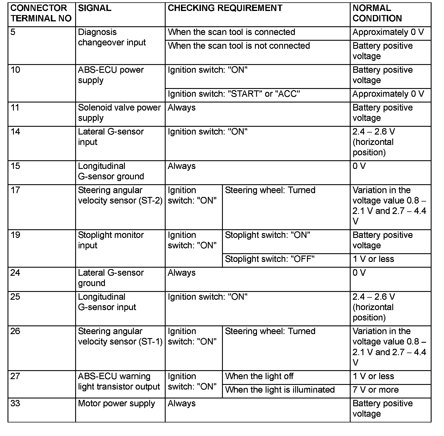 NOTE: Do not measure terminal voltage for approximately three seconds after ignition switch is turned ON. The ABS-ECU performs the initial check during that period.