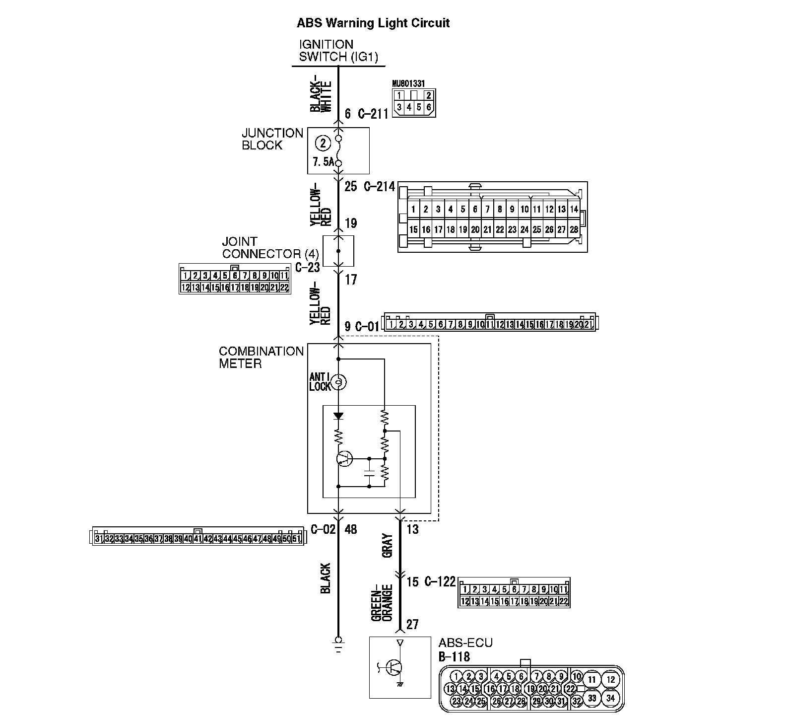 The wire between combination meter connector C-01 (terminal 13) and ABS-ECU connector B-118 (terminal 27)