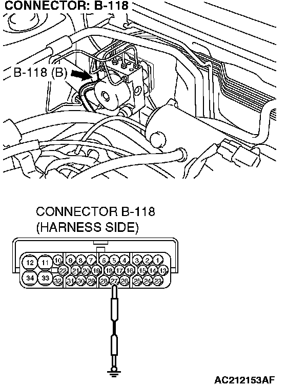 1. Disconnect ABS-ECU connector B-118 and check at the harness side connector.