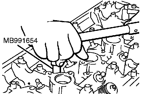Using the special tool MB991653 to loosen the cylinder head bolts.