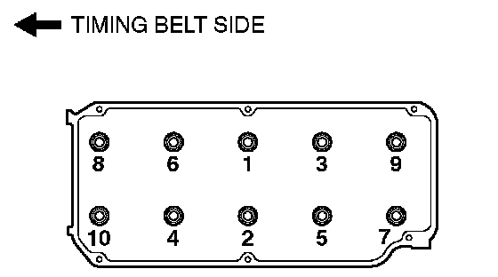 3. Using special tool MB991654 tighten the bolts to the specified torque 78 ± 2 Nm (58 ± 1 ft. lbs.), using the tightening sequence shown.
