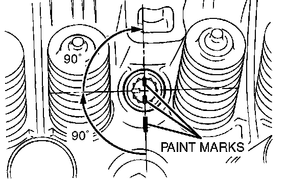 8. Tighten the bolts another 90 degree angle in the same order as in step 7, and check that the paint marks on the cylinder head bolt are aligned with the paint marks on the cylinder head.