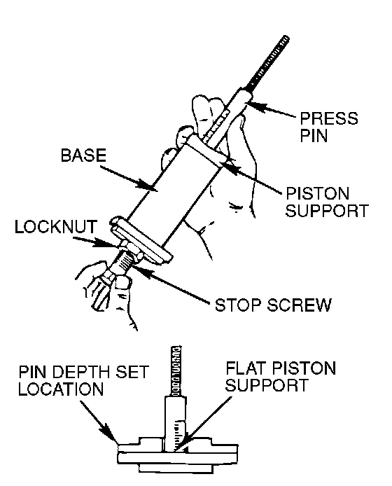 2. Thread the stop screw and lock nut assembly into the base. Fit the correct piston support on top of the base. Insert the press pin, threaded end up, into the hole in the piston support until the press pin touches the stop screw.