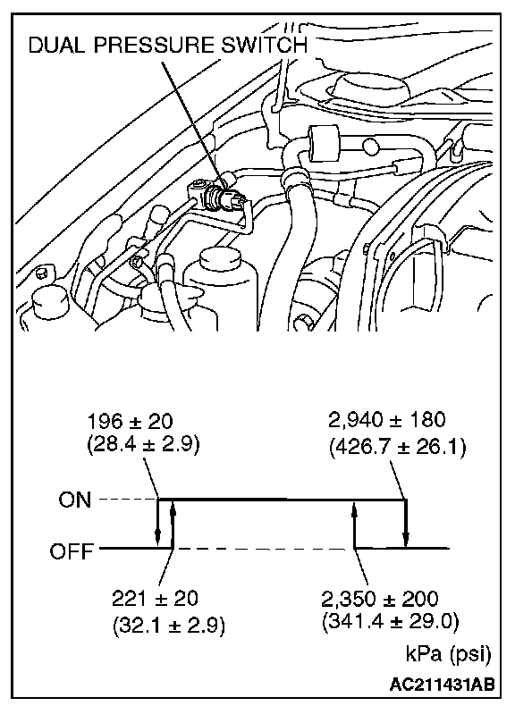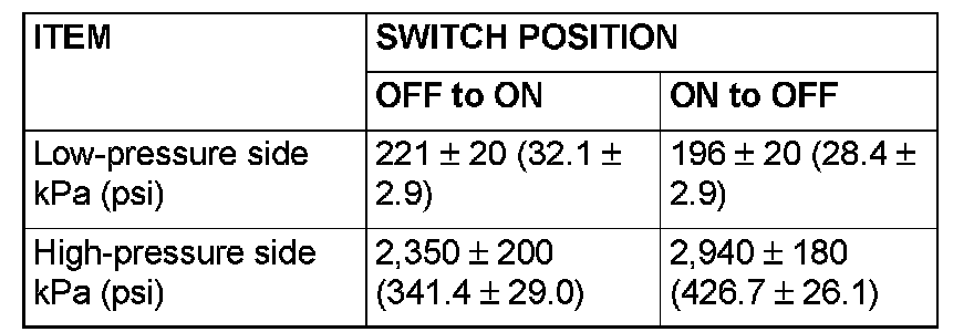3. When the high/low pressure sides of the dual pressure switch are at operation pressure (ON) the resistance should less than two ohms between the terminals. If open circuit, replace the switch.