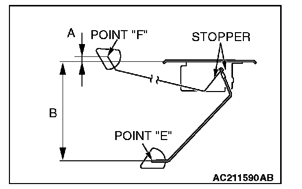 1. Move the float and measure height A at point "F" (highest) and B at point "E" (lowest) with the float arm touching stopper.