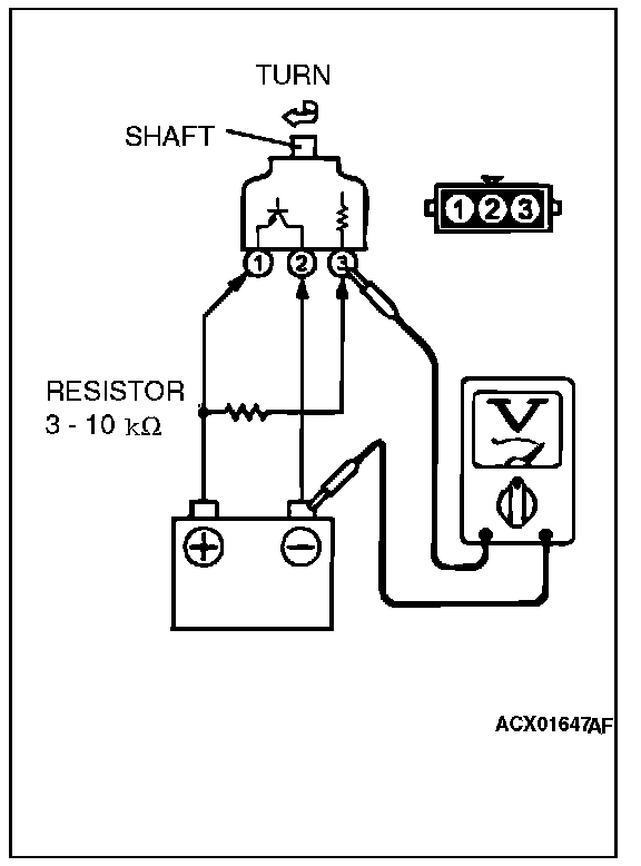 2. Turn the shaft of the vehicle speed sensor and check that there is voltage between terminals 2 - 3. (1 turn = 4 pulses)