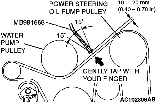 5. Hold special tool MB991668 to the middle of the drive belt between the pulleys (at the place indicated by arrow), approximately 10 - 20 mm (0.40 - 0.78 inch) away from the rear surface of the belt so that it is perpendicular to the belt (within an angle of ± 15 degree).