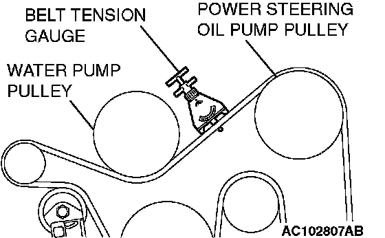 2. Use a belt tension gauge in the middle of the belt between the pulleys (at the place indicated by the arrow) to measure that the belt tension is within the standard value.