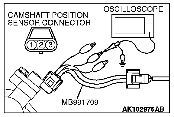 1. Disconnect the camshaft position sensor connector, and connect the test harness special tool (MB991709) in between. (All terminals should be connected.)