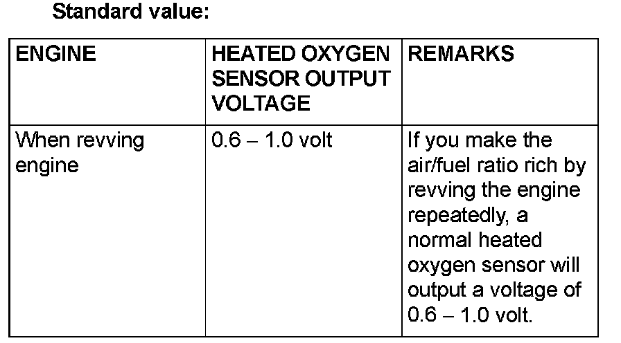 NOTE: If the sufficiently high temperature (of approximate 400 degrees C or more) is not reached although the oxygen sensor is normal, the output voltage would be possibly low although the rich air-fuel ratio. Therefore, if the output voltage is low, use a jumper wire to connect the terminal No.2 and the terminal No.1 of the oxygen sensor with a (+) terminal and (-) terminal of 8 volts power supply respectively, then check again.