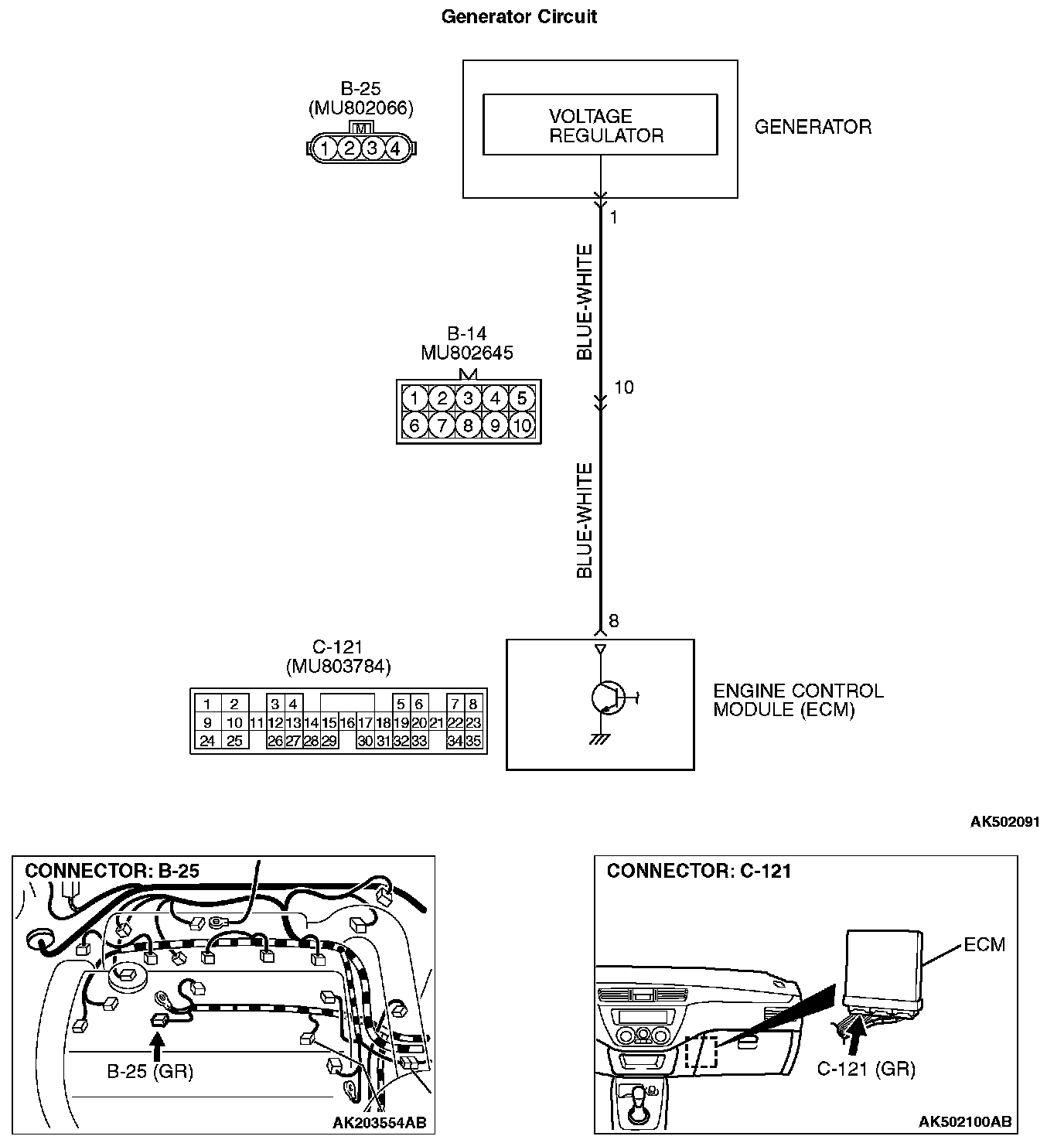 STEP 5. Check for open circuit and short circuit to ground and harness damage between generator connector B-25 (terminal No. 1) and ECM connector C-121 (terminal No. 8).