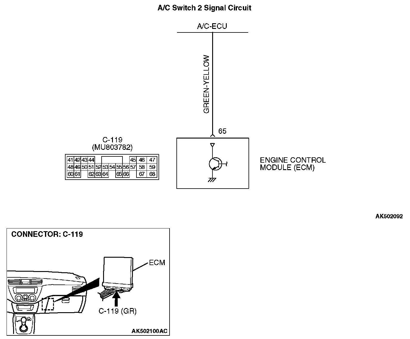 - The A/C-ECU detects how the air conditioning is applying load to the engine, and converts the information to a voltage signal (High voltage = low load, Low voltage = high load). This voltage signal is called "A/C switch 2 signal". The ECM receives this A/C switch 2 signal from the automatic compressor controller through terminal No. 65, and determines the idle-up speed according to the high or low air conditioning load.
