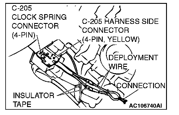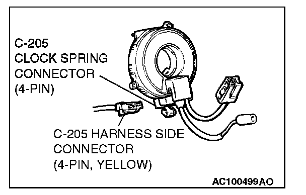 4. Remove the connection between the C-205 clock spring connector (four-pin) and the harness side connector (four-pin, yellow).