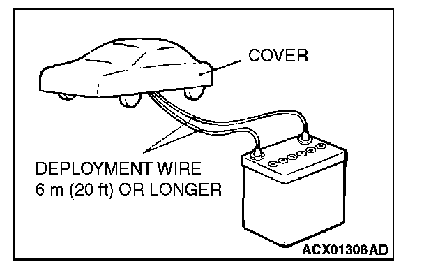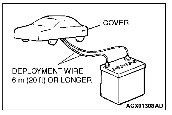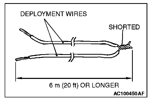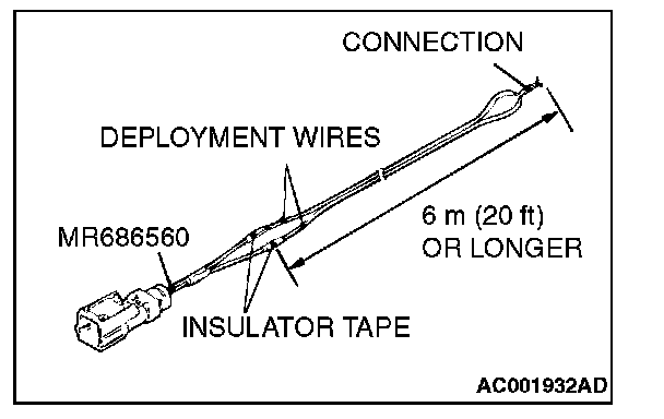 5. Connect deployment wires, each 6 meters (20 feet) or longer, to the two leads of special tool MB686560, and cover the connections with insulation tape. The other ends of the deployment wires should be connected to each other (short-circuited), to prevent sudden unexpected deployment of the air bag module.