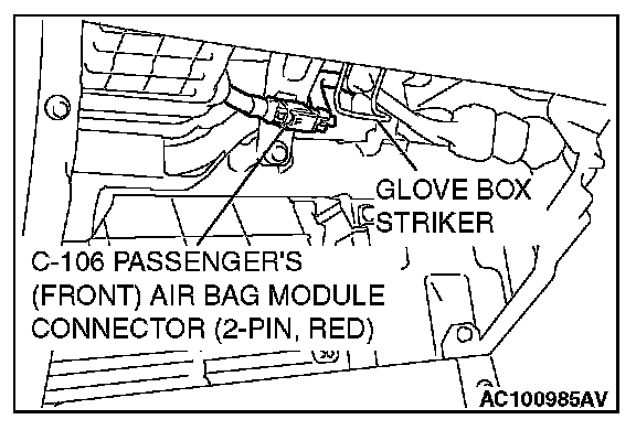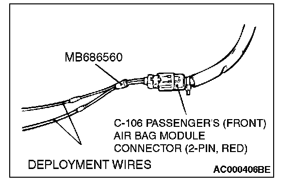 6. Connect the C-106 air bag module (front passenger's side) connector (two-pin, red) to special tool MB686560 and move the deployment wires out of the vehicle.