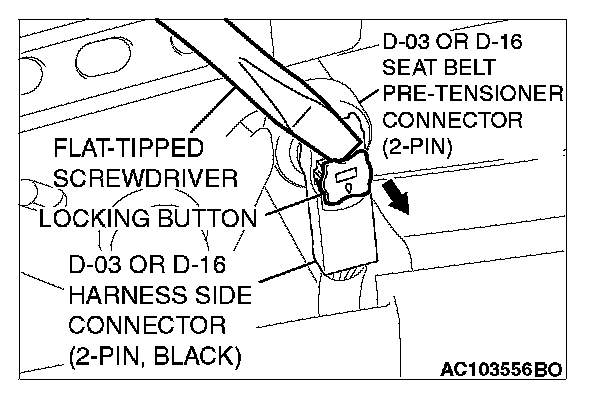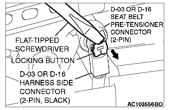 4. Execute the following steps to disconnect the connection between D-03 or D-16 seat belt pre-tensioner connector (two-pin) and harness side connector (two-pin, black).