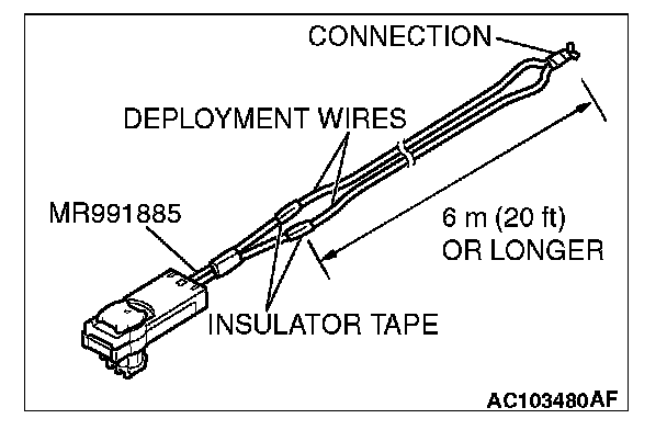 5. Connect deployment wires, each 6 meters (20 feet) or longer, to the two leads of special tool MB991885, and cover the connections with insulation tape. The other ends of the deployment wires should be connected to each other (short-circuited), to prevent sudden unexpected operation of the seat belt pre-tensioner.
