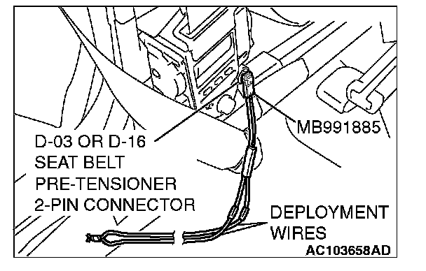 6. Connect the special tool MB991885, which the deployment wires is attached to, to the seat belt pre-tensioner connector.