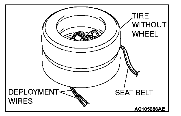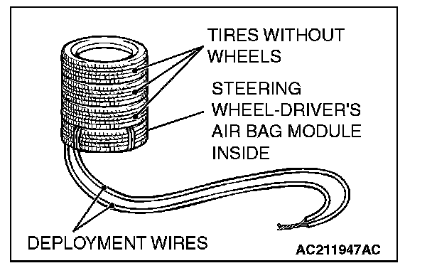 7. Route the deployment harness connected to driver's air bag module beneath old tyres with wheels. Then, secure the steering wheel-driver's air bag module assembly with the deployment surface facing up.