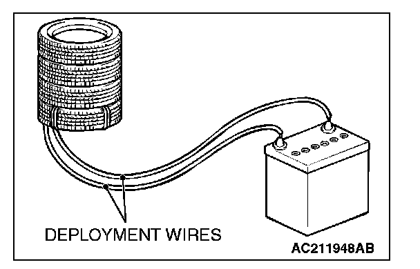 7. At a location as far away from the air bag module as possible, and from a shielded position, disconnect the two connected wires from each other, and connect them to the two terminals of the battery (which has been removed from the vehicle) to deploy the air bag.