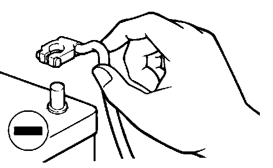 ^ Before connecting or disconnecting the negative battery cable, be sure to turn the ignition switch to the "LOCK" (OFF) position and turn off the lights. (If this is not done, there is the possibility of semiconductor parts being damaged.)