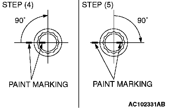 Apply a paint mark to the heads of the cylinder head bolts and cylinder head, then tighten 90 degree angle as shown.