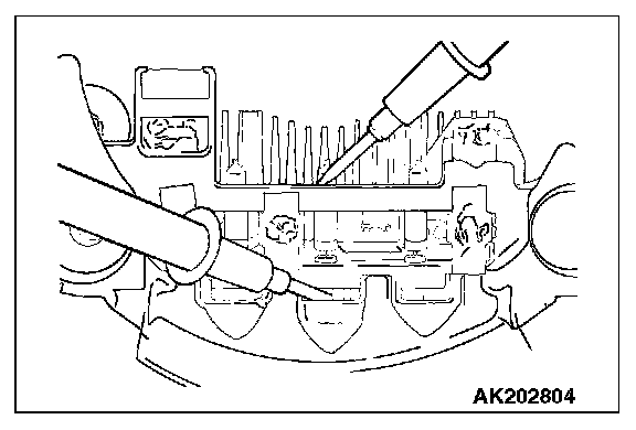 2. Check the condition of the (-) heat sink by checking continuity between the (-) heat sink and each of the stator coil lead connecting terminals.