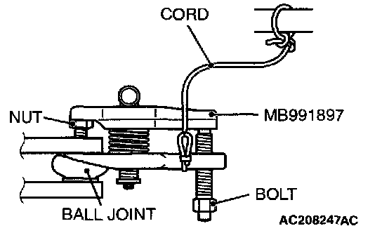 ^ Do not remove the nut from ball joint. Loosen it and use special tool MB991897 to avoid possible damage to ball joint threads.