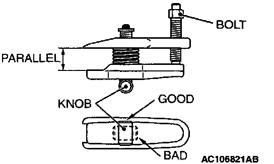 2. Turn the bolt and knob as necessary to make the jaws of special tool MB991897 parallel, tighten the bolt by hand and confirm that the jaws are still parallel.