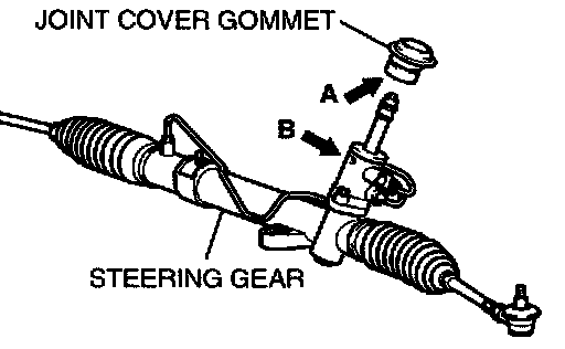 Align the joint cover grommet notch (arrow A) with the steering gear lug (arrow B), and then install the steering joint cover to the steering gear.