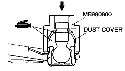 3. Using special tool MB990800, press the dust cover until it contacts the lower arm assembly.