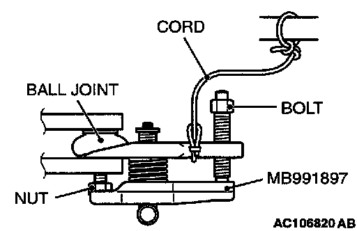 ^ Do not remove the nut from ball joint. Loosen it and use special tool MB991897 to avoid possible damage to ball joint threads.