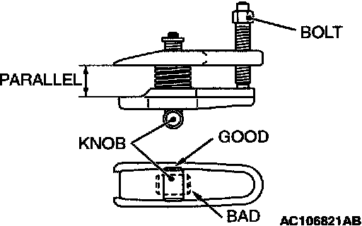 2. Turn the bolt and knob as necessary to make the jaws of the special tool MB991897 parallel, tighten the bolt by hand and confirm that the jaws are still parallel.