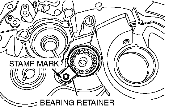 Install the bearing retainer so that the stamp mark is visible, and tighten the mounting bolt to the specified torque.