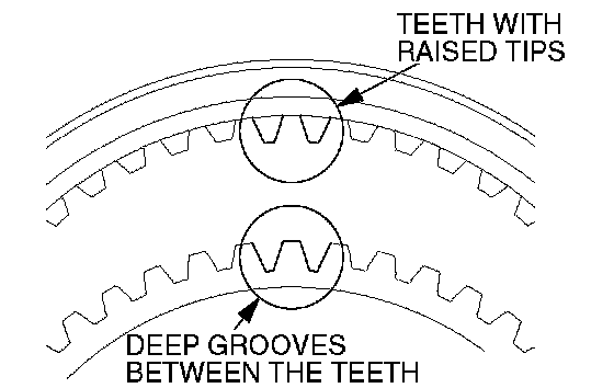 2. Install the synchronizer sleeve so that the areas with teeth that have raised tips (three areas total) are aligned with the areas on the synchronizer hub that have deep grooves between the teeth (three areas total).