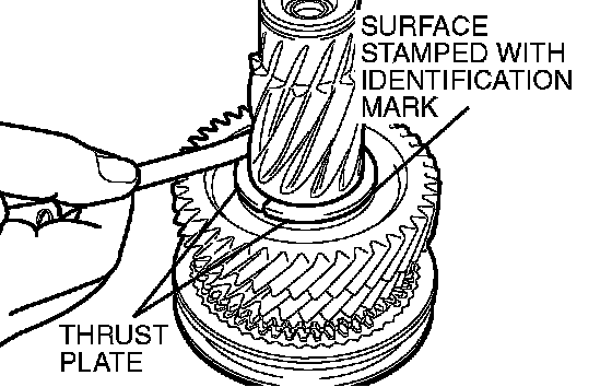 1. Install the thickest thrust plates that can be fitted in the groove of input shaft. Install the thrust plate so the surface stamped with the identification mark is facing up.