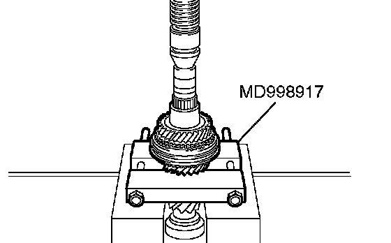Using special tool MD998917, support the 3rd gear and remove the 5th gear sleeve, thrust washer, 4th gear, needle bearing, 4th gear sleeve, 3rd-4th synchronizer assembly, synchronizer outer ring, synchronizer cone, synchronizer inner ring, and 3rd gear.