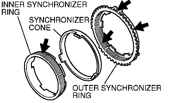 2. Check the synchronizer ring inner cone surface for damage or wear. Also check that the inside ridges are intact.