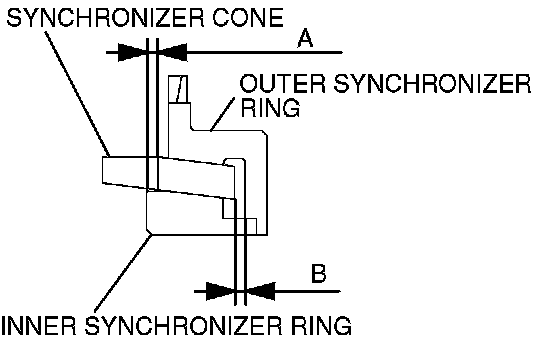 4. Combine the synchronizer rings and synchronizer cone, and check clearances A and B shown in the illustration. Replace them if either of the clearances is greater than the limit.