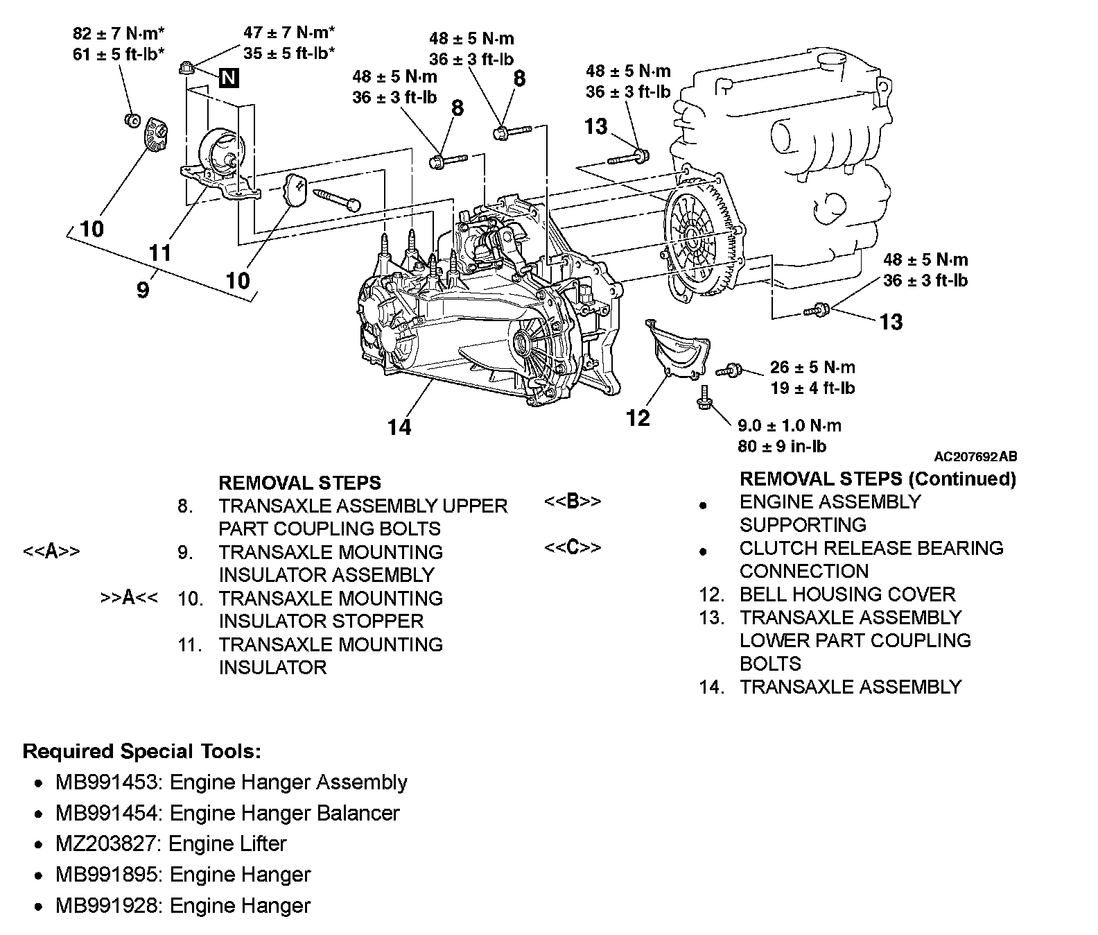 1) Set special tools MB991453 and MZ203827 to the vehicle to support the engine assembly.