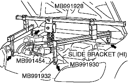 2) Set the engine hanger (special tool MB991928) to the strut mounting nuts and the radiator support upper insulator mounting bolts, which are located in the engine compartment, as shown.