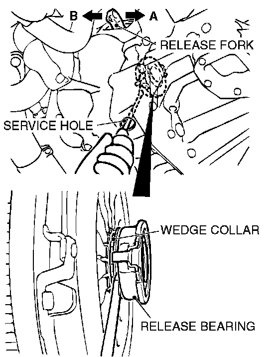 2. While pushing the release fork by hand in direction A, insert a flap-tip screwdriver between the release bearing and the wedge collar.