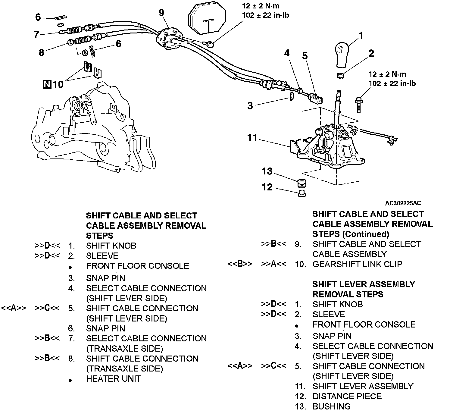 WARNING: Be careful not to subject the SRS-ECU to any shocks during removal and installation of the shift cable and select cable assembly.