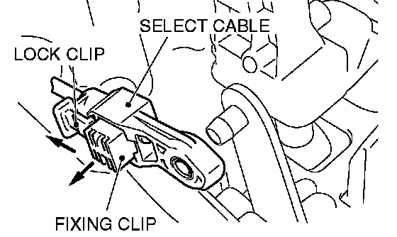8. Pulling the select cable slightly towards the cabin side, press in the fixing clip of the select cable. Then, return the lock clip back to the original state.