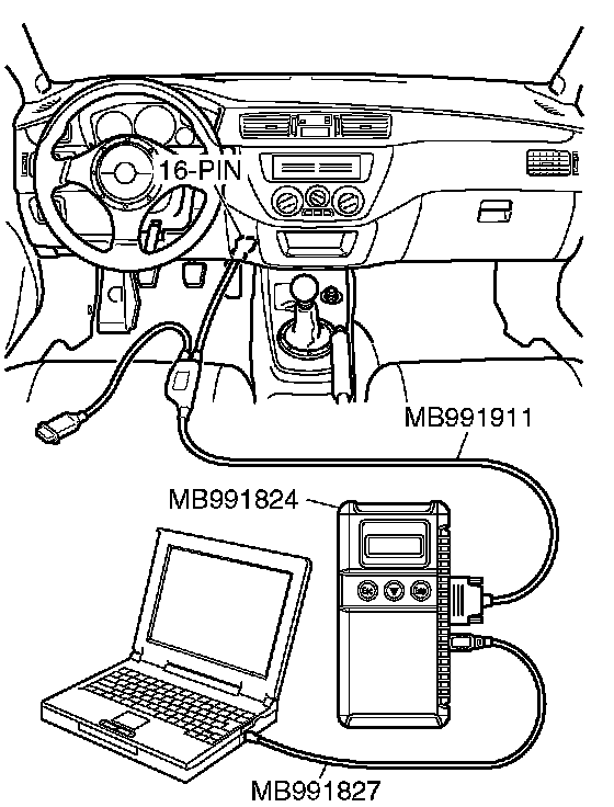 CAUTION: To prevent damage to scan tool MB991958, always turn the ignition switch to the "LOCK" (OFF) position before connecting or disconnecting scan tool MB9919/58.