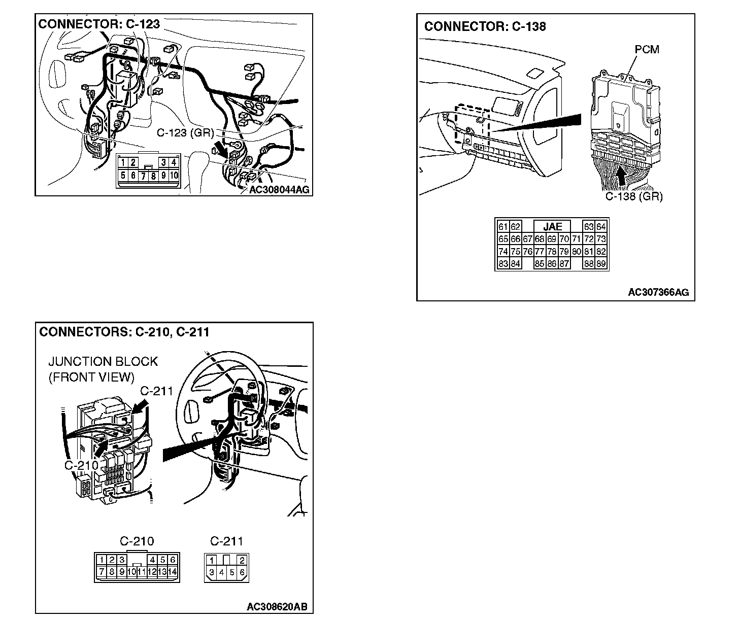 STEP 3. Check intermediate connector C-123 and junction block connector C-210 for loose, corroded or damaged terminals, or terminals pushed back in the connector.