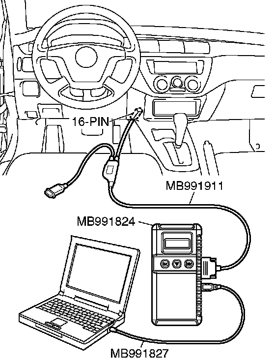 CAUTION: To prevent damage to scan tool MB991958, always turn the ignition switch to the "LOCK" (OFF) position before connecting or disconnecting scan tool MB991958.