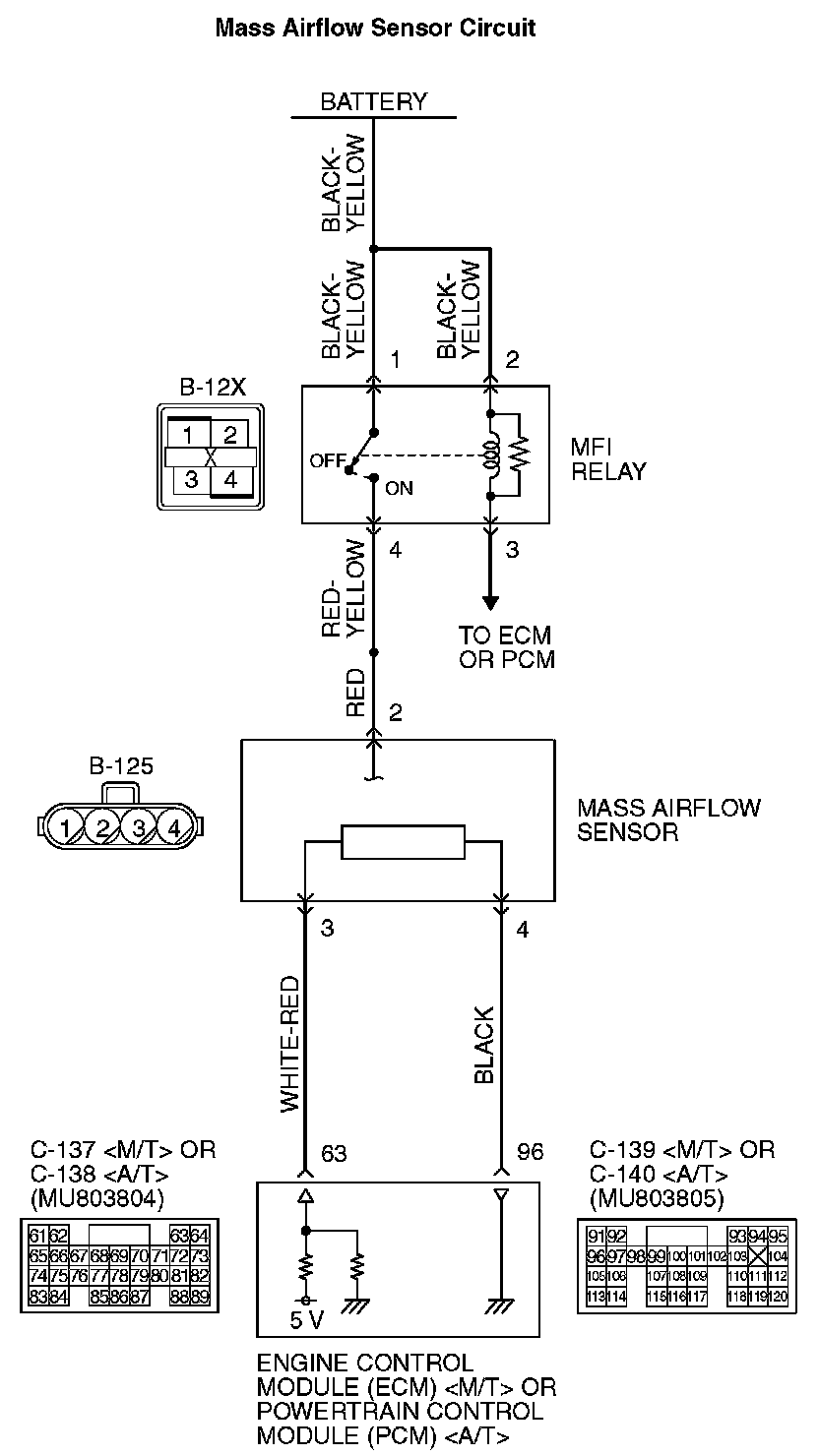 - The mass airflow sensor power is supplied from the MFI relay (terminal No. 4), and the ground is provided on the ECM
