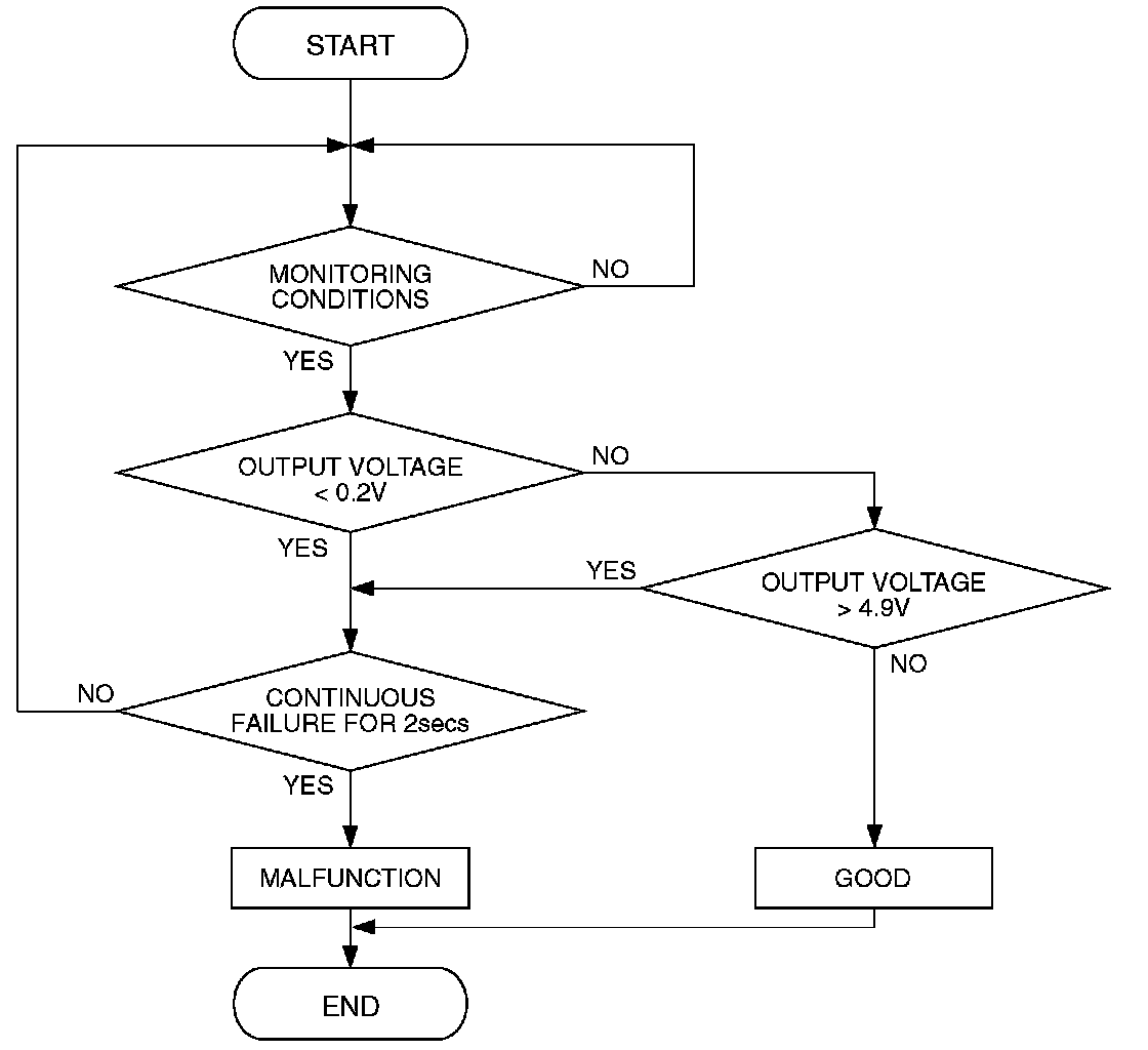 - Mass airflow sensor output voltage has continued to be higher than 4.9 volts for 2 seconds.