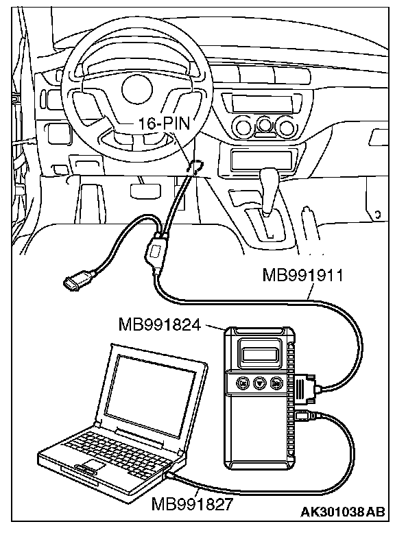 CAUTION: To prevent damage to scan tool MB991958, always turn the ignition switch to the "LOCK" (OFF) position before connecting or disconnecting scan tool MB991958.